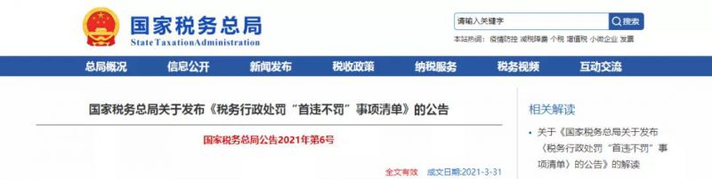 现将《税务行政处罚“首违不罚”事项清单》予以发布,自2021年4月1日起施行。